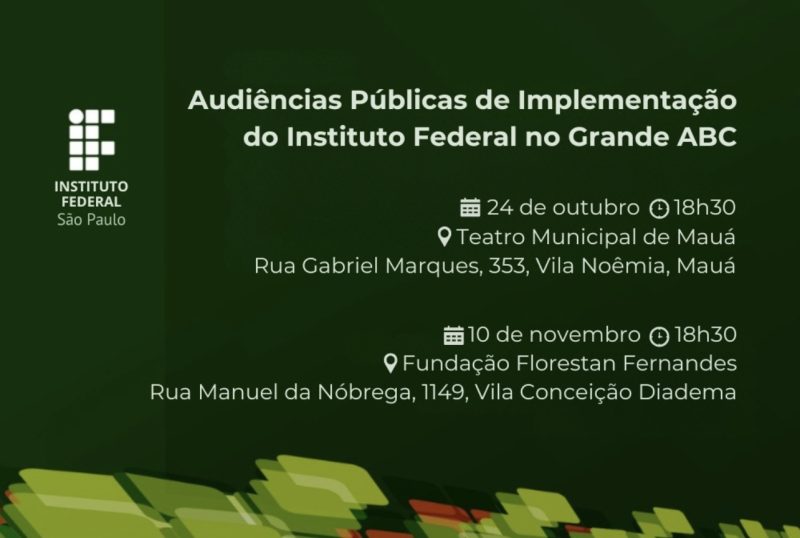 A audiência em Mauá será em 24 de outubro (sexta-feira), às 18h30, no Teatro Municipal de Mauá (Rua Gabriel Marques, 353, Vila Noêmia).