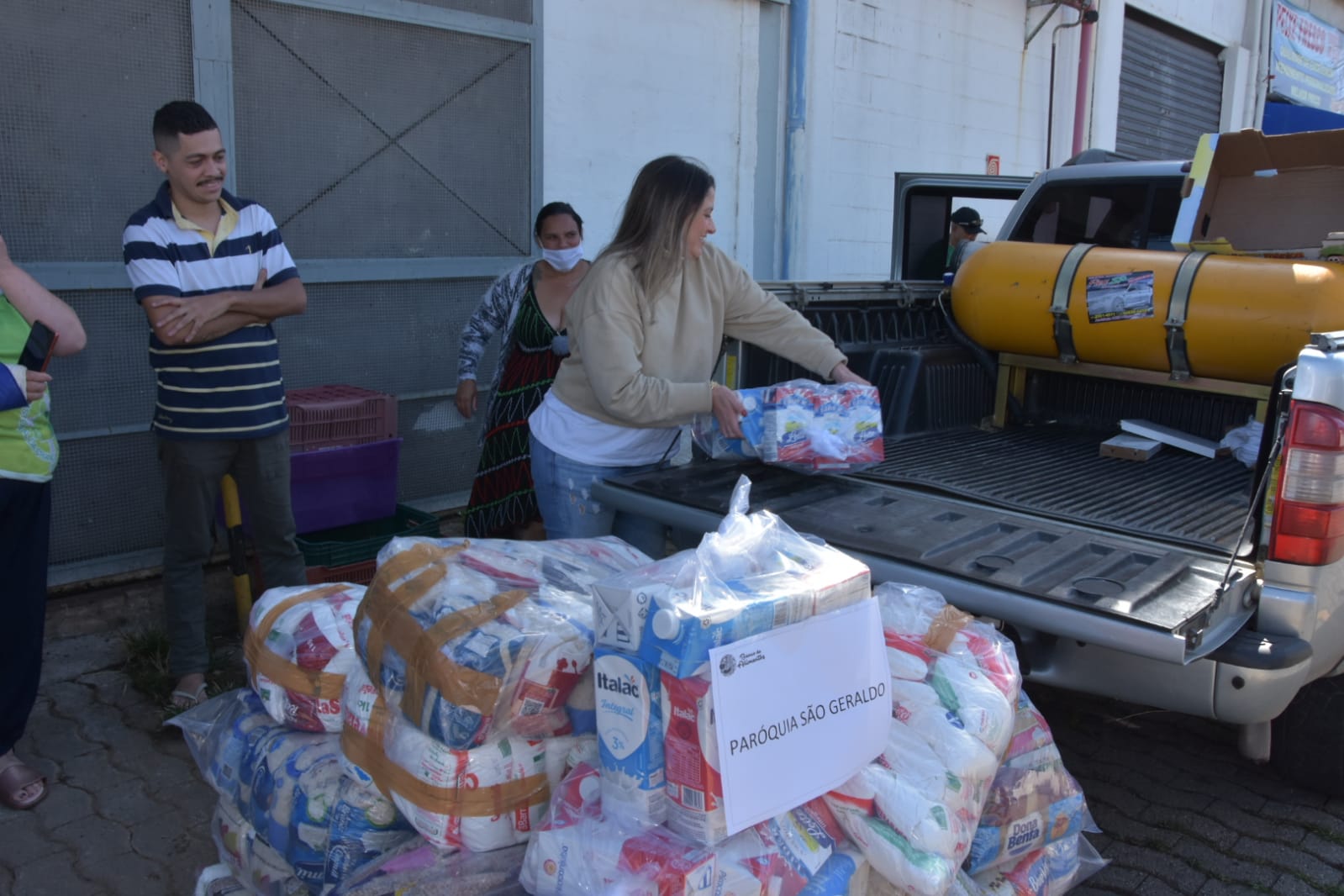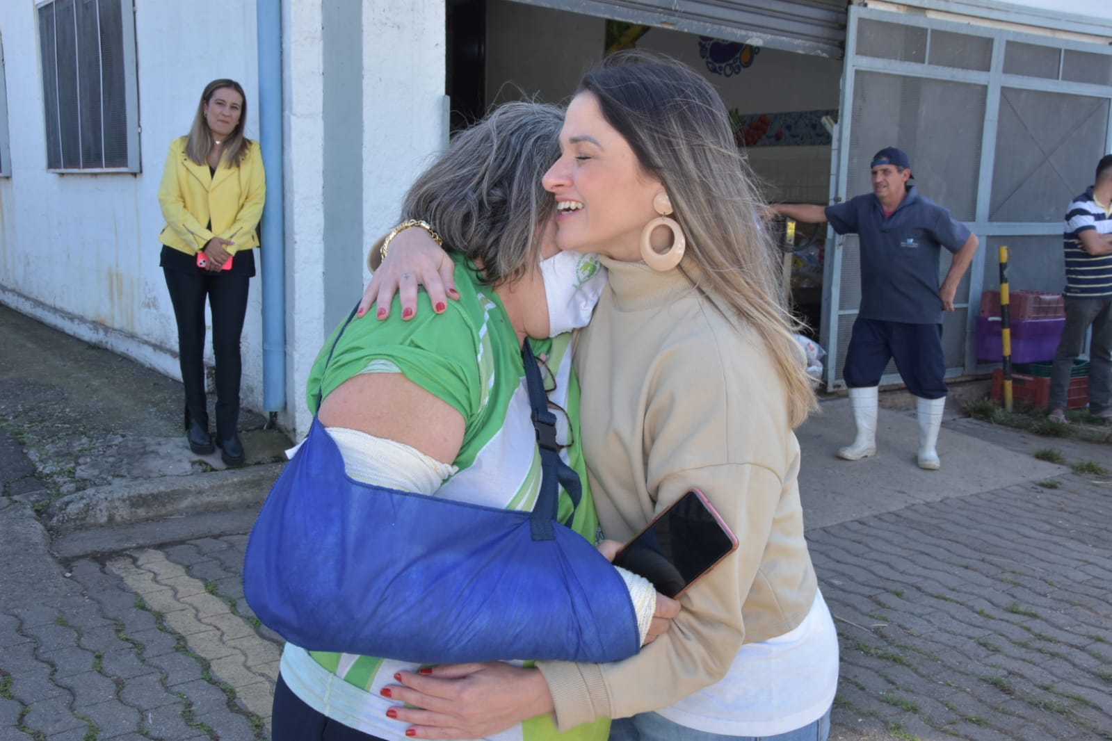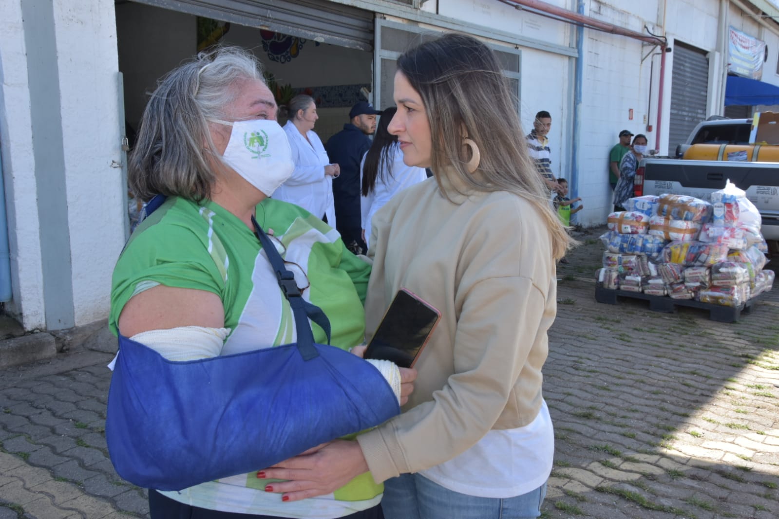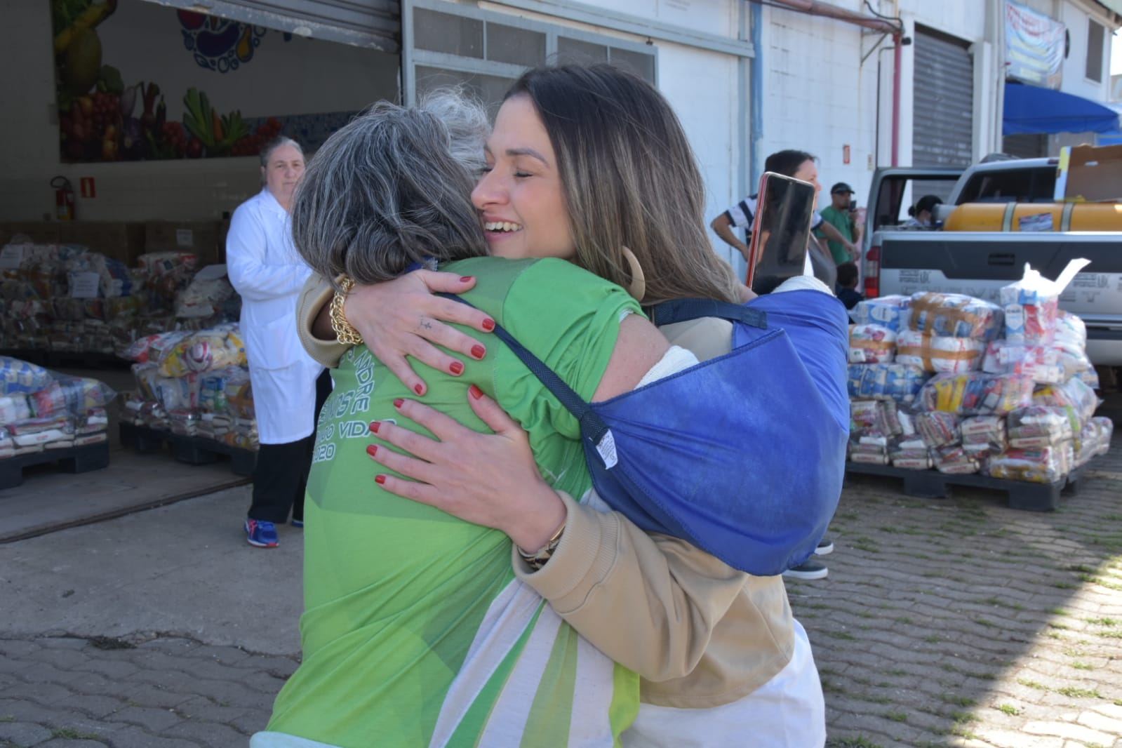 Presidente do Fundo Social de Solidariedade, Ana Cláudia de Fabris abraçou Dona Rosana, a consolou e, na sequência, ajudou, da mesma forma, a carregar o veículo da entidade com as doações.