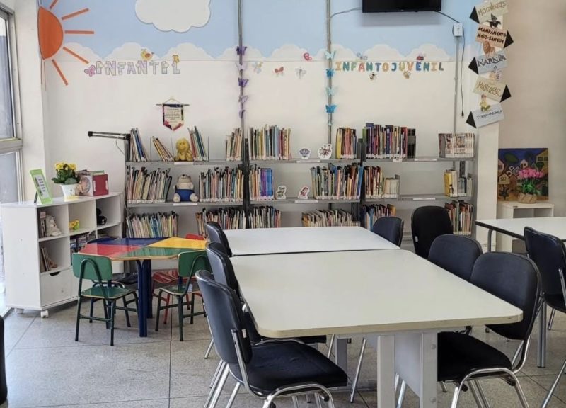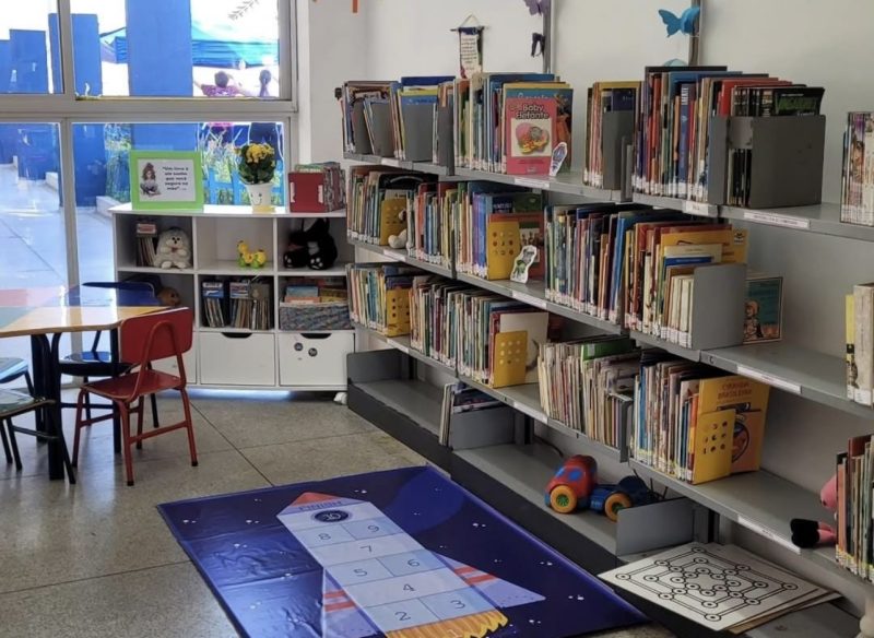 A biblioteca também ganhou uma nova pintura e um espaço dedicado ao acervo infantil, para as crianças poderem passar mais tempo explorando as possibilidades de leitura de forma aconchegante.