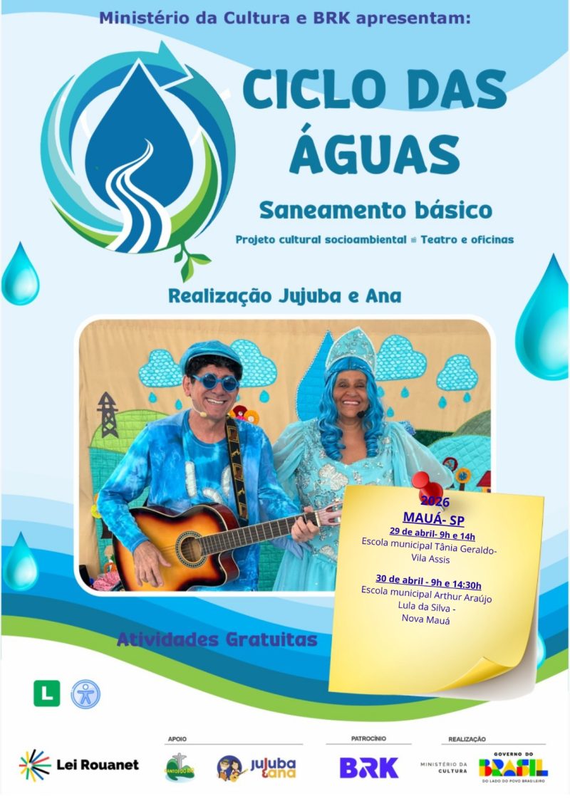 A BRK, concessionária responsável pelos serviços de esgoto em Mauá, leva para os alunos das escolas municipais ““Tânia Geraldo” e “Arthur Araújo Lula da Silva”, nos dias 29 e 30 de abril, o espetáculo teatral “Ciclo das Águas – Saneamento básico é vida”.