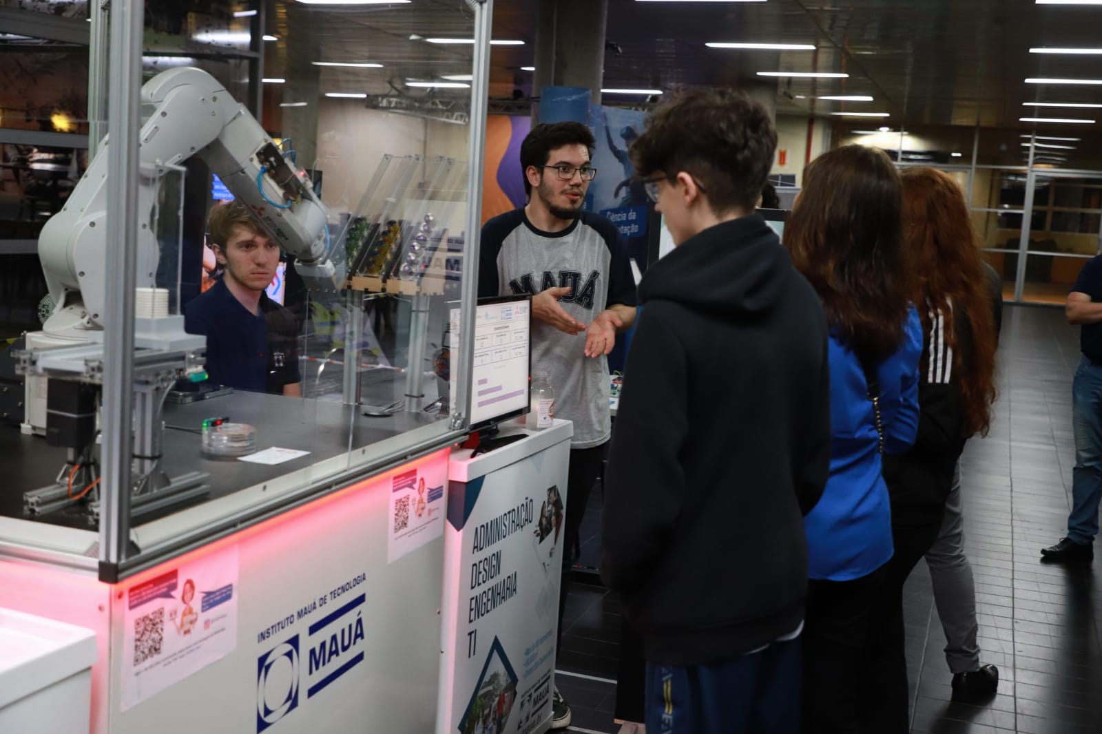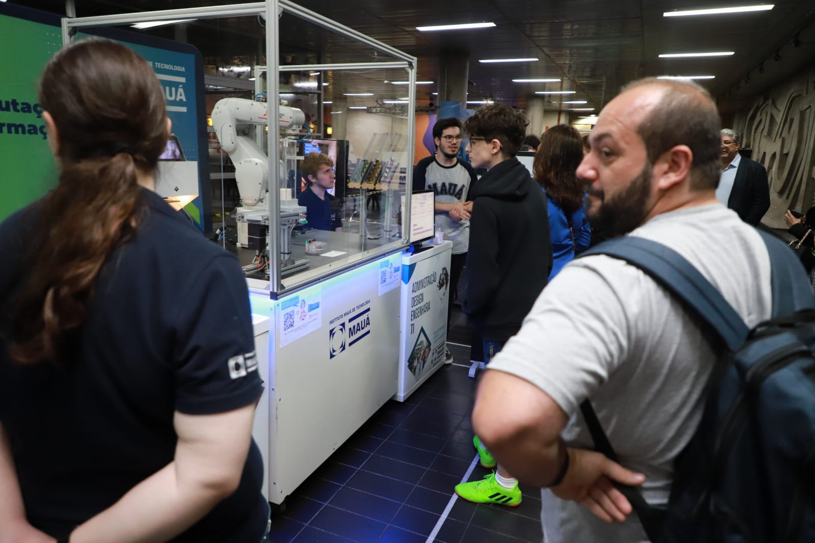 Tem ainda, da mesma forma, a bancada com braço robótico que imprime o rosto do cliente no café, do Instituto Mauá de Tecnologia.