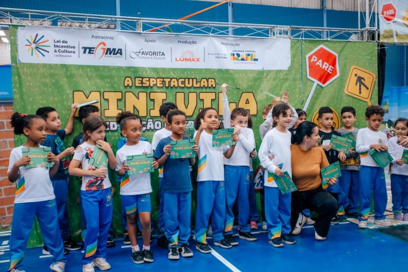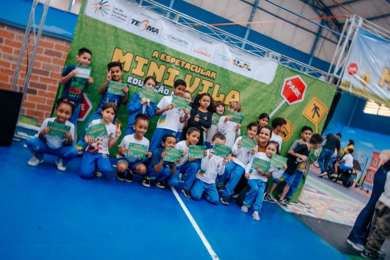 Na sequência, as crianças são convidadas a entrar na mini vila, onde passam por situações como pedestres e aprendem sobre placas de trânsito.