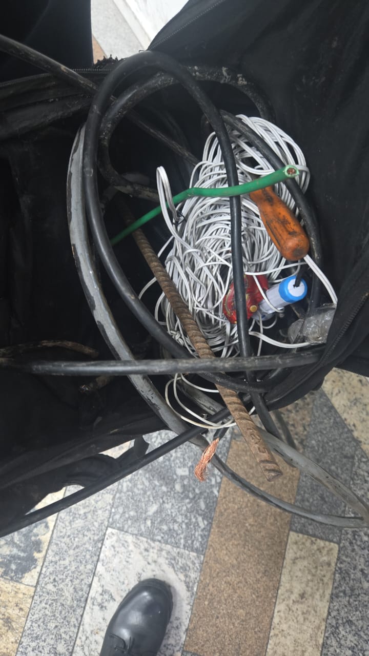 Na mochila dele foram encontrados cerca de 15 metros de cabos já cortados, além de ferramentas utilizadas no rompimento e uma barra metálica usada para cavar o solo.