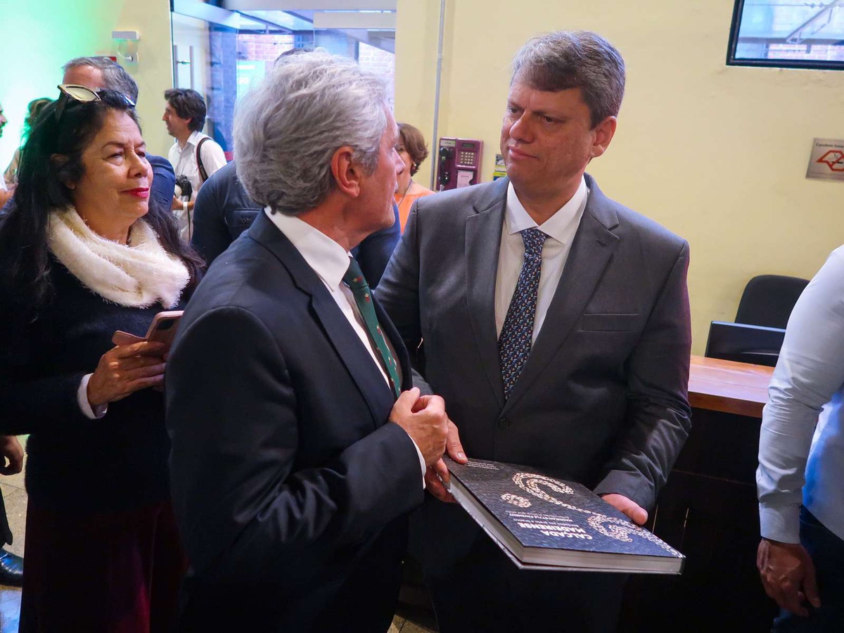 ‘José Manuel Rodrigues, que está em visita oficial do Brasil, ofereceu o livro ‘Calçada Madeirense’ ao Governador do Estado de São Paulo, Tarcísio de Freitas e uma peça de Bordado Madeira.'”