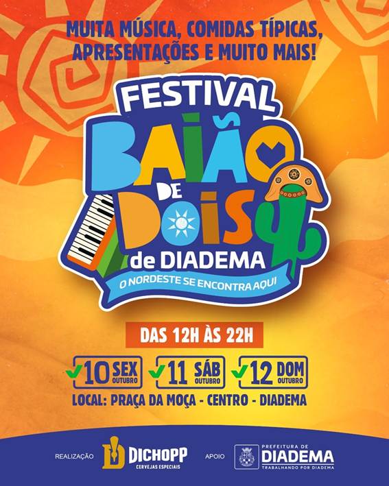 Entre 10 e 12 de outubro, Diadema receberá, acima de tudo, o 1º Festival Baião de Dois – “O Nordeste se Encontra Aqui”.