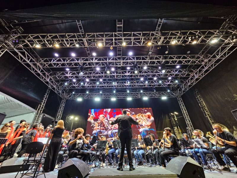 Banda Sinfônica da Emarp e Coral Meraki no palco Choco Paço. Foto: Gabriel Mazzo/PMETRP