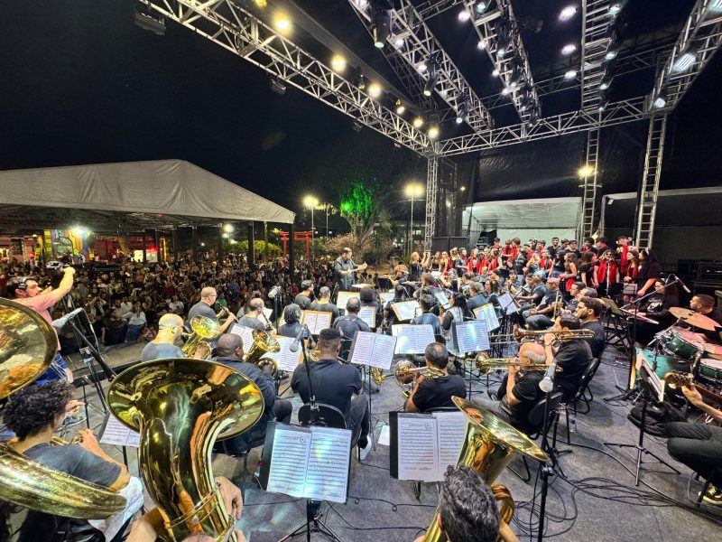Banda Sinfônica da Emarp e Coral Meraki apresentaram Concerto Especial Pop no palco Choco Paço. Foto: Gabriel Mazzo/PMETRP