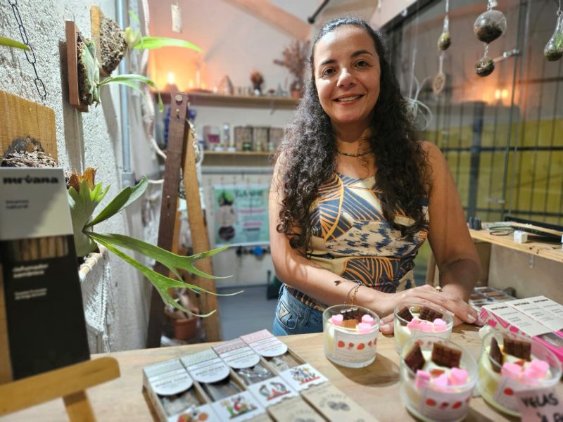 O mesmo entusiasmo tomou conta da artesã Gabi Fernandes, do Green Arts Ateliê Botânico. “Decidimos fazer uma vela de morango com chocolate e tivemos muita preocupação de ser um aroma agradável e não enjoativo. Aí surgiu a vela de moranguete, que está irresistível. É a primeira vez que participo do festival nesse formato diferente, que abrange também o comércio local”, disse, por exemplo.