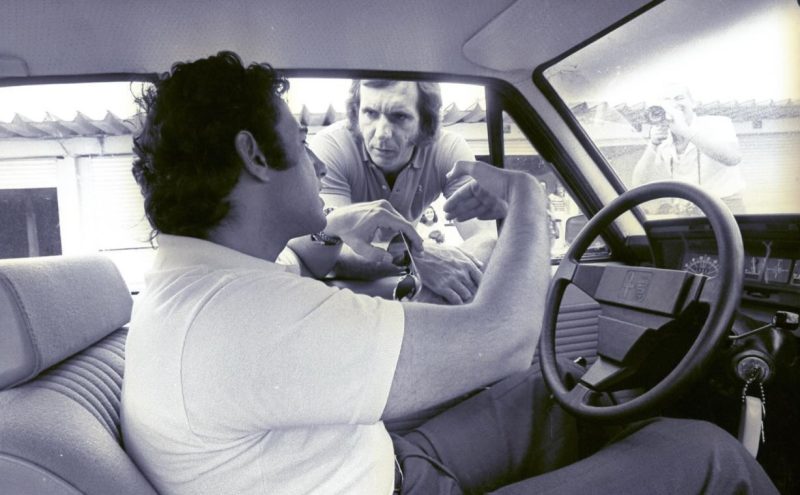 José Carlos Pace fala com Emerson Fittipaldi (na janela) em Interlagos, em meados da década de 1970, em reportagem-fotográfica do genial Hélio Campos Mello. Foto de rede social com uso autorizado pelo autor