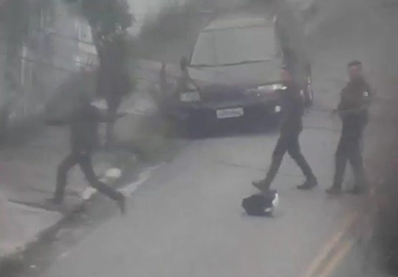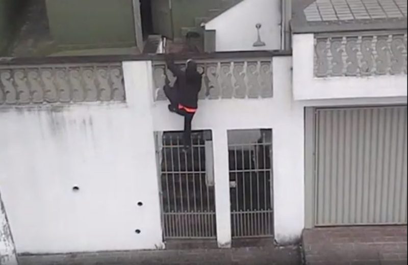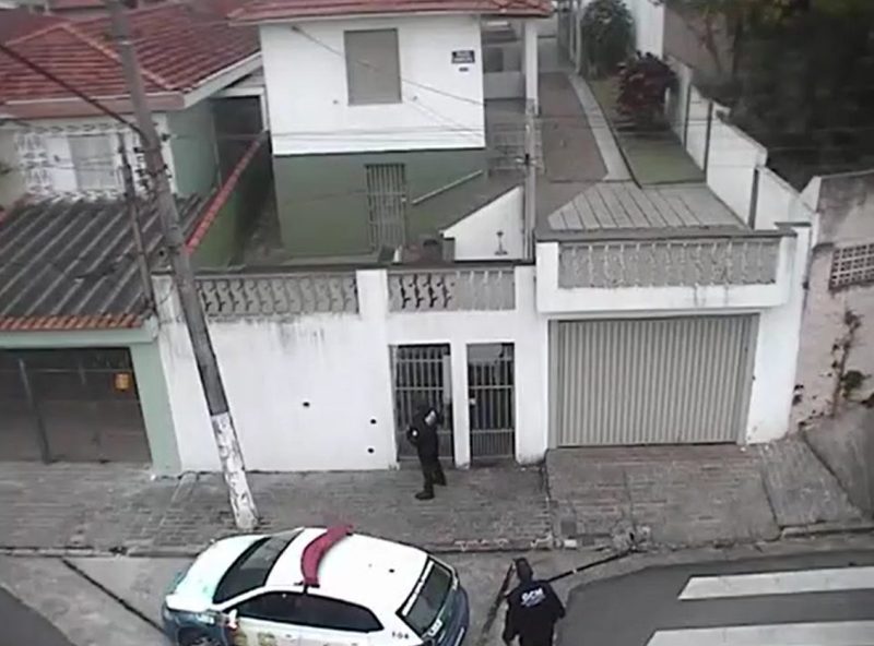 A ação ocorreu, portanto, por volta das 5h30, após o CCO (Centro de Controle Operacional) flagrar o indivíduo – vestindo jaqueta preta e blusa com detalhes em laranja – pulando o muro da casa e saindo com mochilas volumosas.