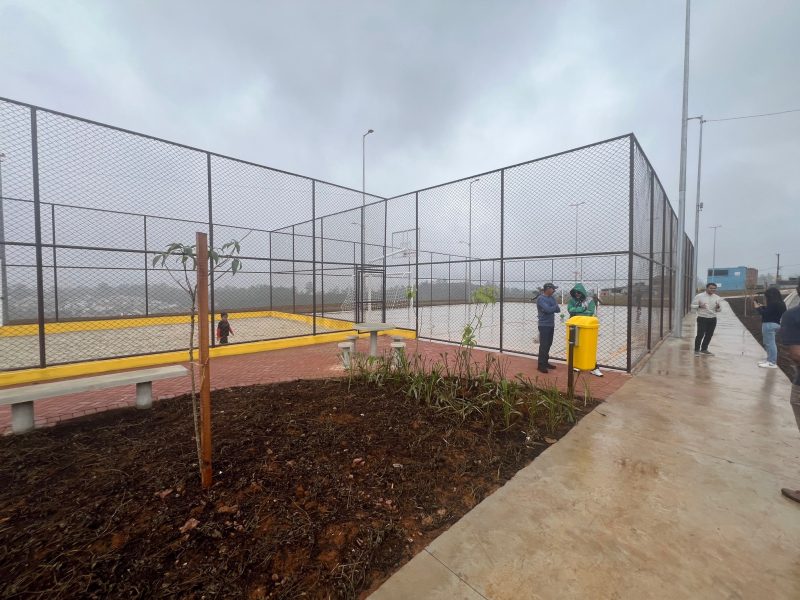 O espaço possui quadra poliesportiva e de areia; playground; pista de caminhada com área de alongamento e área de convivência com bancos.
