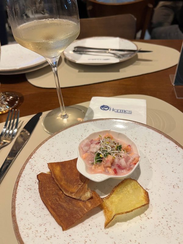 Ceviche encantador; tapas (se é que podemos usar um termo espanhol na casa) com camarão, bolinho de bacalhau delicioso… enfim, tudo perfeito.