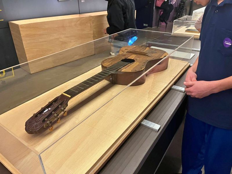 Há instrumentos, como o violão, manuscritos, letras, roupas, acessórios e objetos pessoais.