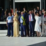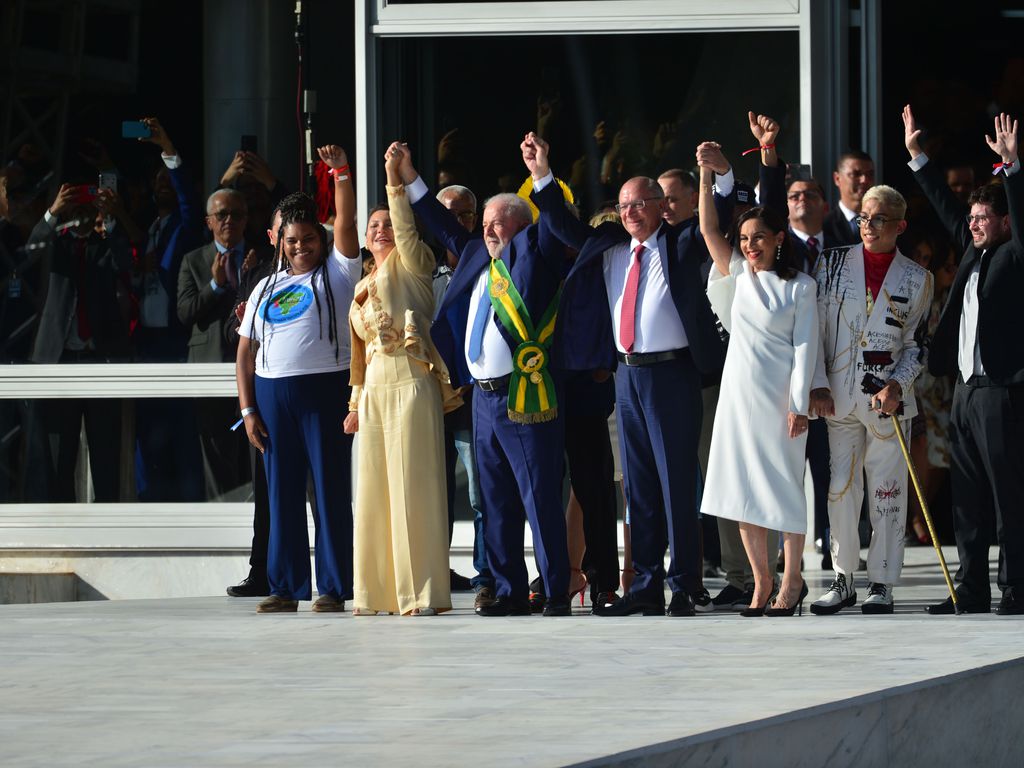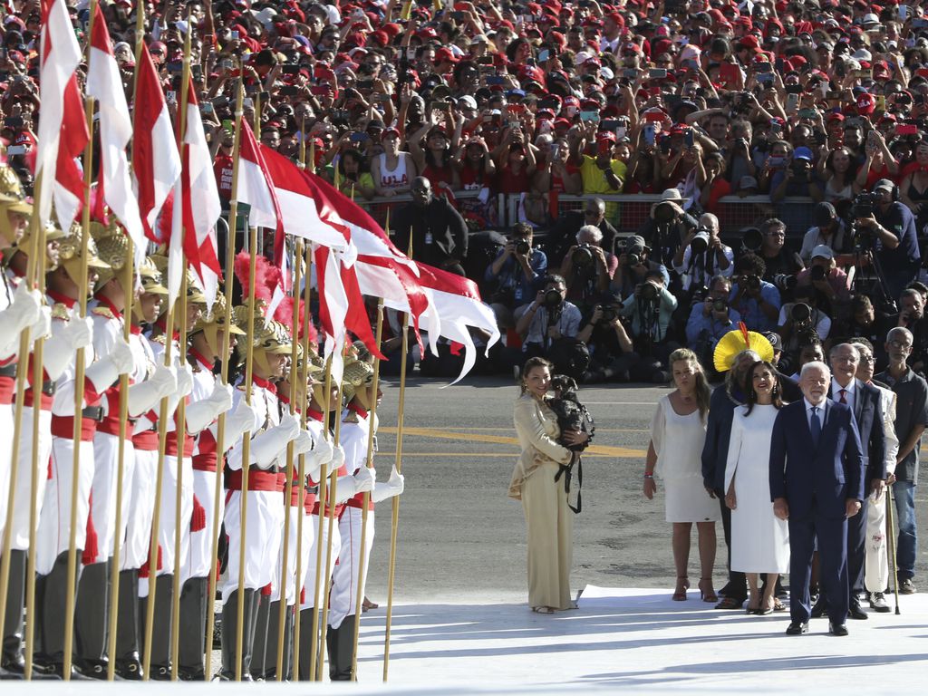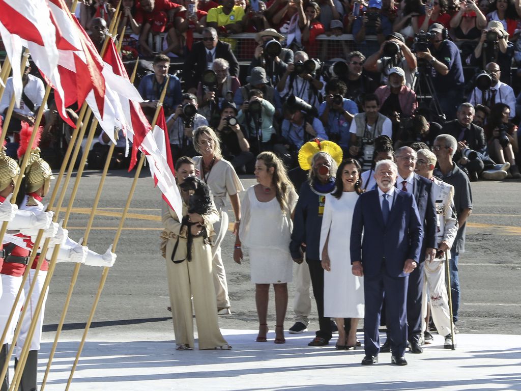 Começou a subir a rampa no colo de Janja, mas pelo que se viu na tevê, pediu para ficar ao lado de Lula durante uma parte do trajeto.