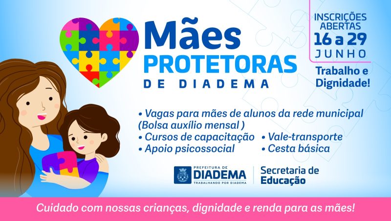 O edital com todas as regras, critérios e prazos já está disponível no site da Prefeitura. As inscrições para participar da seleção começam hoje dia 16 de junho e vão até 29 de junho de 2025, exclusivamente pelo portal oficial: https://maesprotetoras.diadema.sp.gov.br