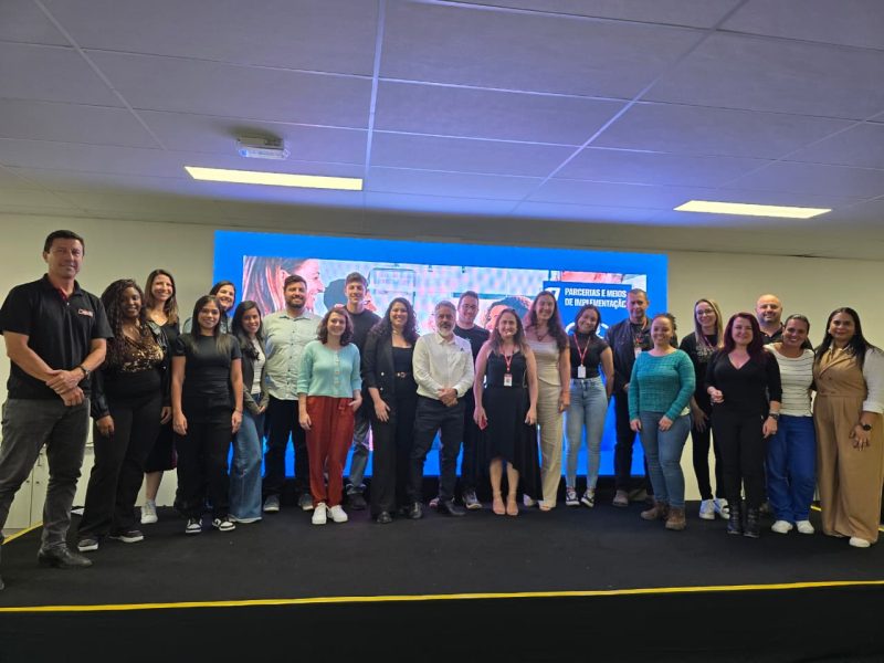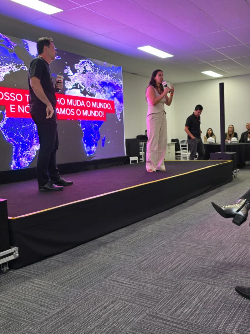 No auditório, o evento seguiu com um momento de reintegração conduzido pelas colaboradoras do RH, Carolina Farinazzo e Larissa Lopes.