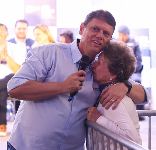 Em determinado momento de seu pronunciamento, Tarcísio desceu do palco a abraçou a sempre vereadora Cida Ferreira.