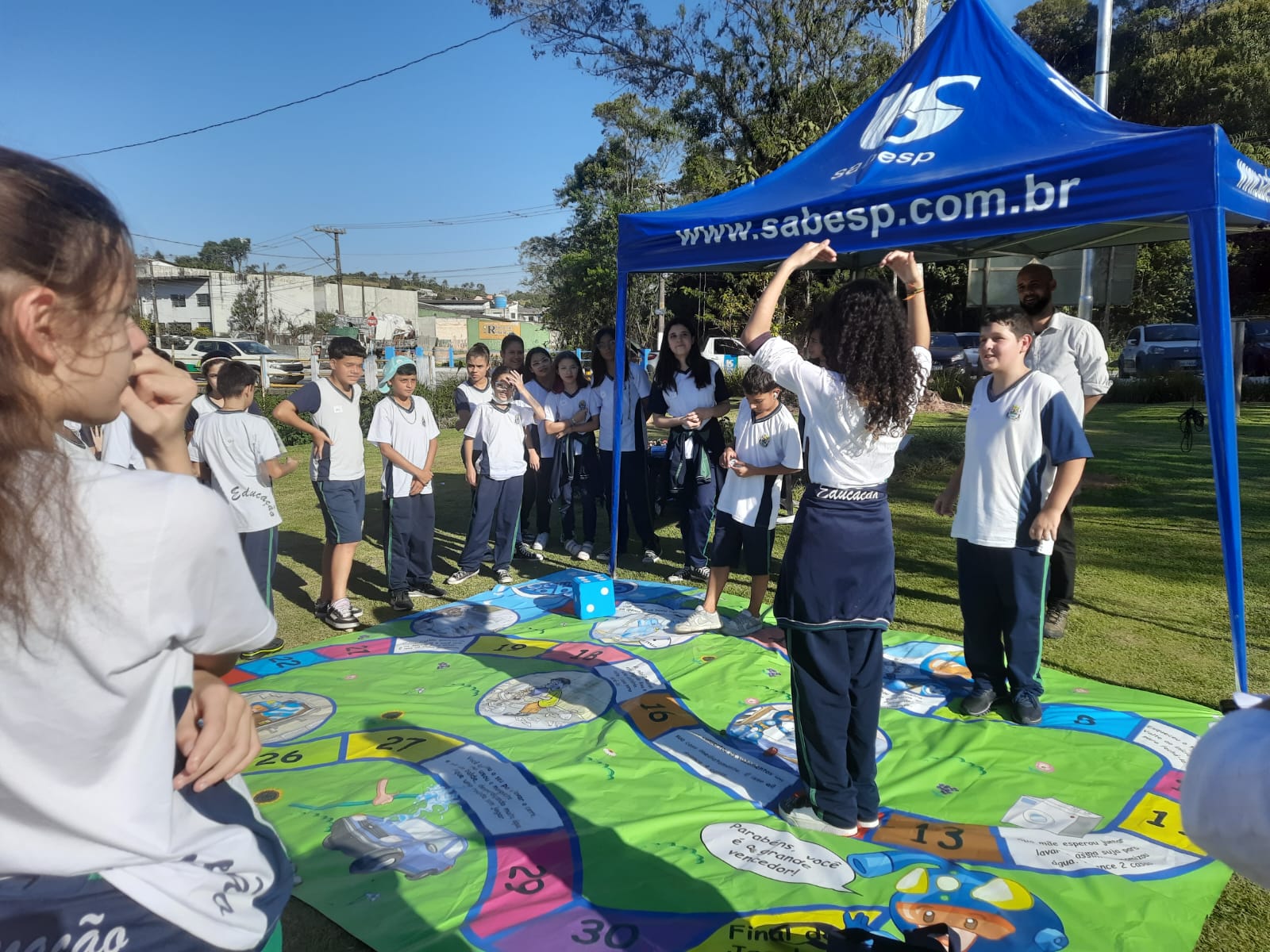 As crianças receberam um lápis e uma HQ da Sabesp como brinde, além de participarem de brincadeira sobre a água por meio de um tapete de jogo de tabuleiro, premiando com outros brindes os vencedores.