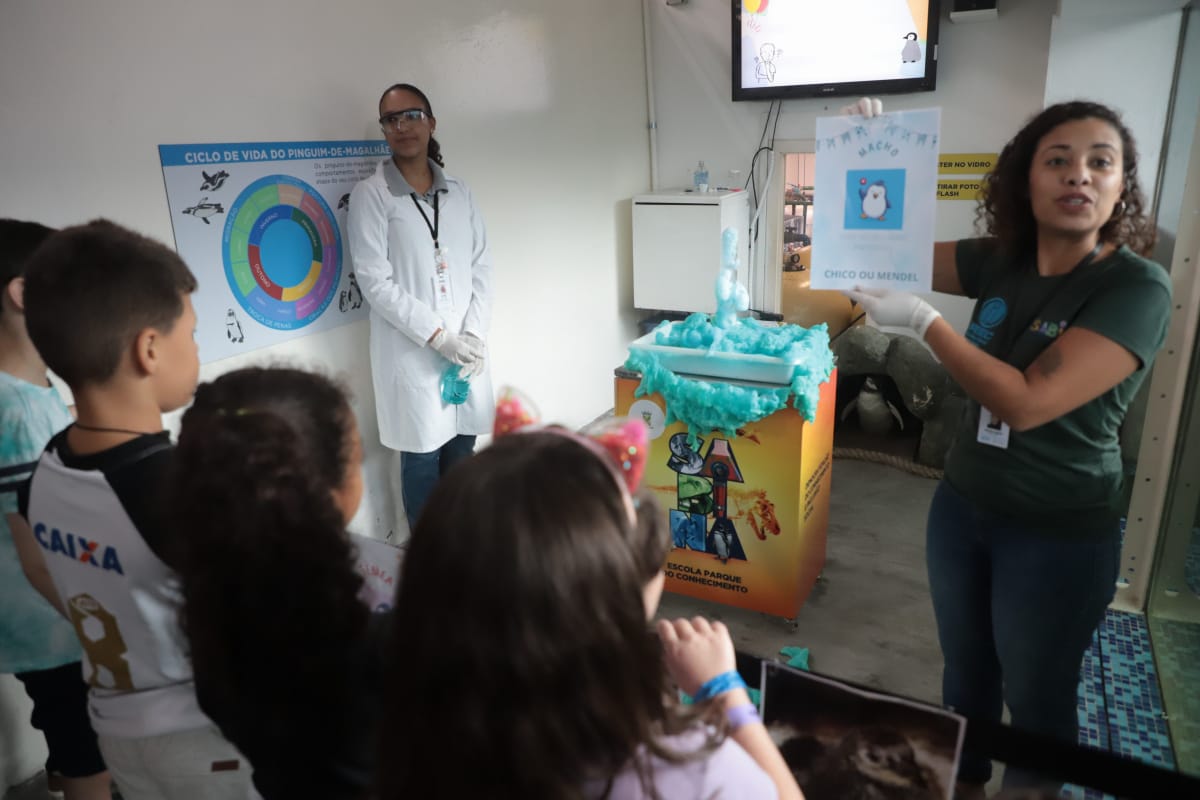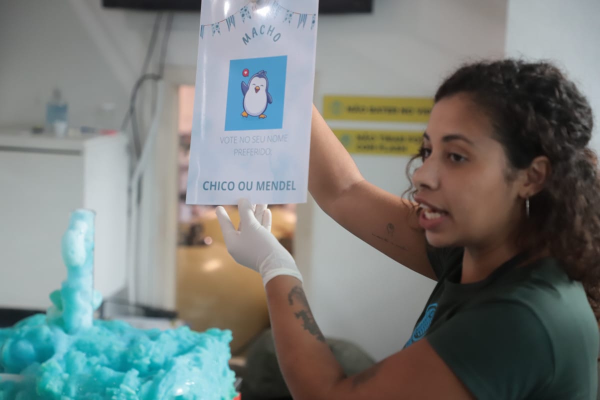 Por último, a revelação de mais uma fêmea foi a partir da coloração rosa da manjuba, peixe ofertado para alimentação dos pinguins.