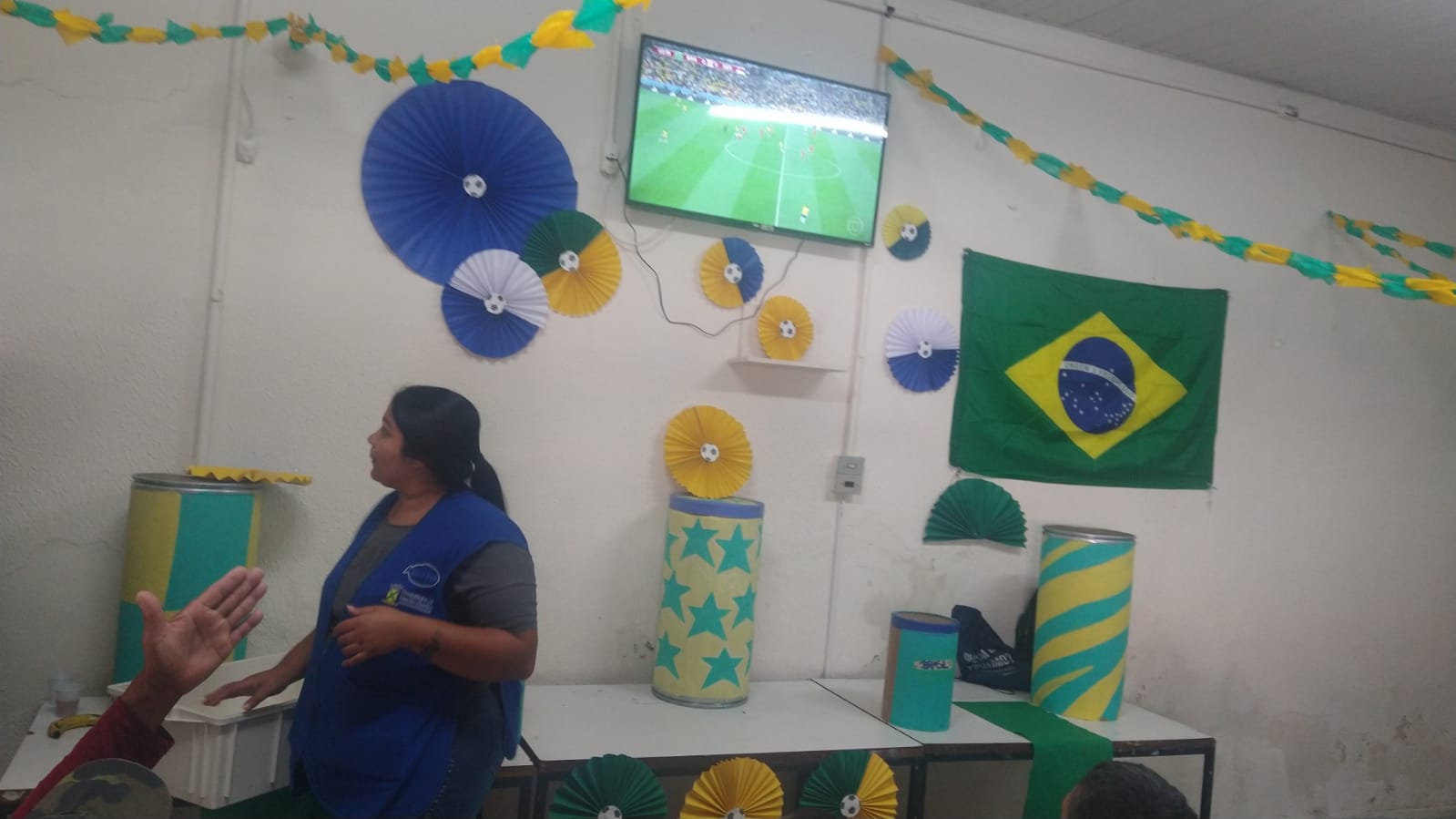Os funcionários do Centro POP (Centro de Referência Especializado para População em Situação de Rua), juntamente com os usuários, decoraram o local com as cores do Brasil, com enfeites e artesanatos produzidos durante as oficinas temáticas.